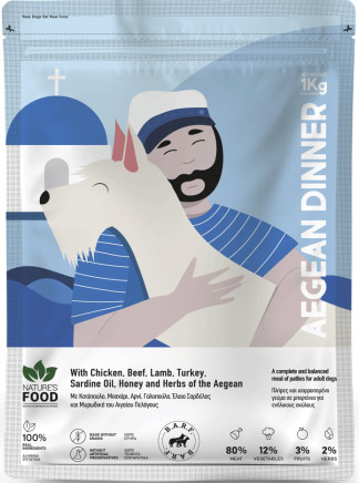Συστατικά: Ολόκληρο κοτόπουλο 35%, κρέας από μοσχάρι 20%, πατσάς πράσινος από αρνί 15%, κρέας από γαλοπούλα 10%, λαχανικά 10% (μαρούλι, αγγούρι, παντζάρια, ντομάτα), φρούτα 3% (μπανάνα, κράνμπερι), ζωμός από μοσχάρι, μηλόξιδο, μυρωδικά 2,5%, έλαιο σαρδέλας 1%, εξαιρετικά παρθένο ελαιόλαδο, θυμαρίσιο μέλι 0,5%, σκόνη από φύκι Kelp, ρίγανη 0,3%, σκόνη πράσινου μυδιού 0,2%.