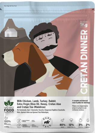 Συστατικά: Ολόκληρο κοτόπουλο 30%, πατσάς πράσινος από αρνί 25%, εντόσθια από αρνί 3%, φιλέτο γαλοπούλας 15%, ολόκληρο κουνέλι 5%, λαχανικά 12% (αγγούρι, καρότο, κολοκυθάκι, ντομάτα), φρούτα 3% (μήλο, φράουλα, κράνμπερι), εκχύλισμα από Κρητικό τσάι Μαλοτήρα 1,25%, έλαιο σαρδέλας, εξαιρετικά παρθένο ελαιόλαδο 0,6%, εκχύλισμα από δίκταμο 0,5%, θυμαρίσιο μέλι 0,5%, Κρητική αλόη 0,25%, κουρκουμάς, πιπερόριζα σκόνη 0,25%, ινδική καρύδα, σπιρουλίνα σκόνη.