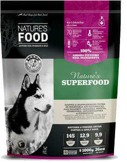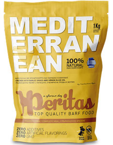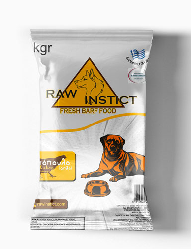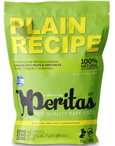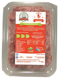 Συστατικά: Κιµάς από κρέας κόκκαλα & συκωτάκια κοτόπουλου (75%), λαχανικά και φρούτα εποχής (25%), έξτρα παρθένο ελαιόλαδο, µηλόξυδο.