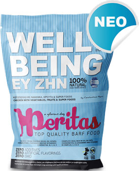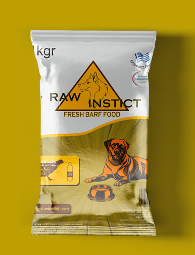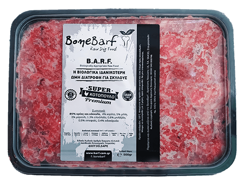 Συστατικά: 35% κρέας και κόκαλα κοτόπουλου, 28% κρέας μοσχαριού, 28% εντόσθια και κρέας αρνιού (καρδιά, πατσάς, νεφρά, συκώτι και πνεύμονες), 5% συκώτι και καρδιά κοτόπουλου, 12% καρότα και μαρούλι, 5% μήλα και μπανάνες, 1% σολομός και ελαιόλαδο, 1% καρύδα, λιναρόσπορος, μηλόξιδο και ελληνικά βότανα, 1% πολυβιταμίνες.