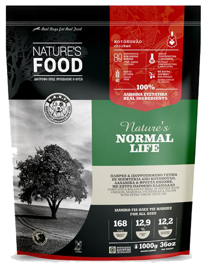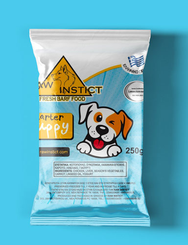 Συστατικά: Κοτόπουλο, συκώτι, λαχανικά εποχής, καρότο, λινέλαιο, αυγό παστεριωμένο , γιαούρτι.